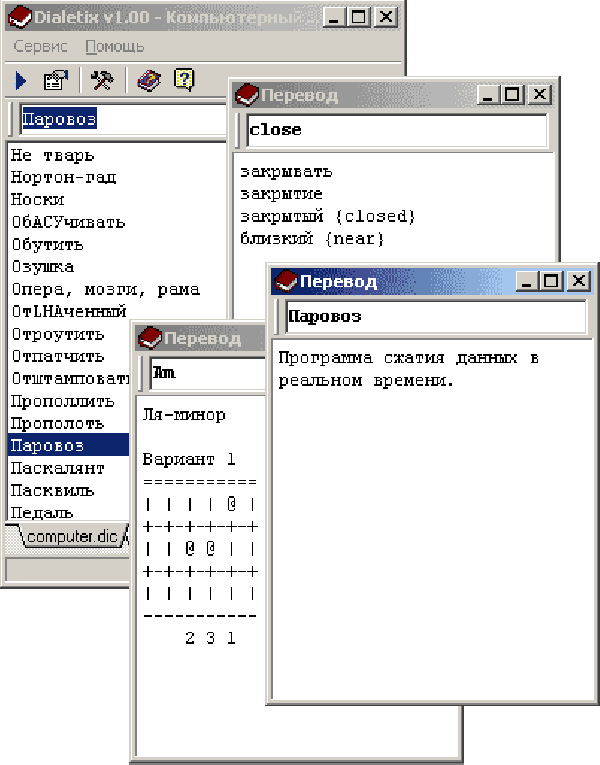 Как видно из приведенного списка, словари могут быть самых разных - типовые словари, аккорды для музыкальных инструментов, адресные книги, словари сокращений, напоминалки, шпаргалки. Если у вас появятся новые словари для Dialetix и вы любезно поделитесь ими - мы с радостью опубликуем их здесь и будем распространять вместе со следующими дистрибутивами! Ссылочка на ваше авторство будет присутствовать обязательно!