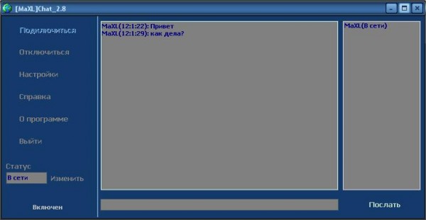 [MaXL]Chat - программа для обмена мгновенными сообщениями по локальной сети(чат). Простой в использовании интерфейс будет понятен даже начинающим пользователям ПК. Программы не требует выделенного сервера, для общения вам необходимо в настройках программы указать требуемый порт, и IP адрес, и всё, можно общаться. Есть возможность отправление приватных сообщений.