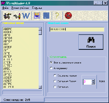 Эта программа предназначена для поиска анаграмм (также возможно осуществлять составление слов из букв другого слова), для отгадывания кроссвордов и для игры в слова, это когда вы загадываете слово и затем на пару с компьютером начинаете составлять из него другие слова. Стоит отметить, что данная программа больше не требует никаких дополнительных библиотек, как это было с предыдущими версиями, кроме этого увеличилась, примерно в 20 раз, скорость выполнения всех процессов. В версии 4.0.2 добавлен поиск слов по шаблону. Без регистрации запускается только 30 раз.