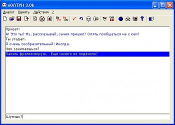 Болтун - это виртуальный собеседник, который обладает зачатками (искусственного) разума. Он реагирует на реплику пользователя своей репликой - таким образом, он "болтает". Программа не претендует на звание программы искусственного интеллекта. Но раз он "думает" перед тем, как ответить, то, наверняка, он обладает хоть каким-нибудь интеллектом. А если это не природный интеллект, то значит, искусственный.:-)