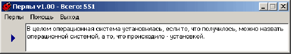 Перлы - это программа-сборник приколов, заметок, наблюдений, комментариев, афоризмов, пословиц, поговорок, крылатых изречений, выссказываний, мыслей со сменными словарями. Программа способствует развитию эрудиции, чувства юмора и улучшению вашего настроения. Время от времени отвлекаясь от тяжелой работы, вы можете почитывать и наматывать на ус крылатые изречения житейской мудрости, а затем блеснуть в компании своей эрудицией и знаниями оригинальных шуток.