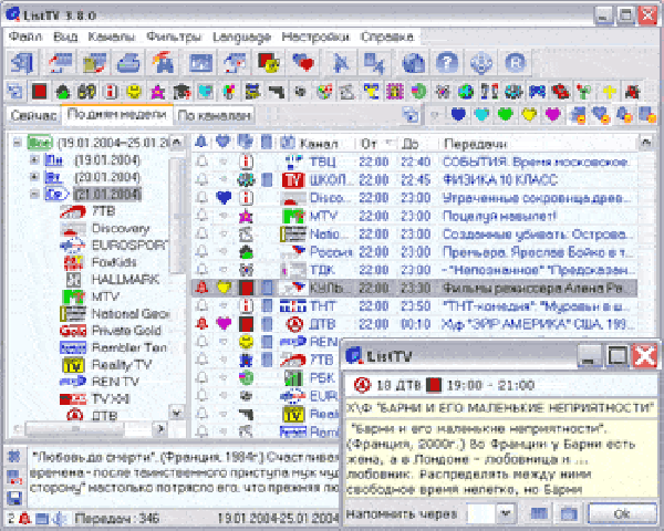 Программа ListTV позволяет в удобной форме просматривать список телепередач. Быстро узнать, что показывают сейчас, и за любой промежуток времени. Помечать любимые передачи, делать поиск по всем дням и каналам и управлять выводимой на экран информацией. Печать программы ТВ, с широкими параметрами настройки, а также напоминание о наиболее любимых программах. Переключение каналов на тв-тюнере. Поддержка более 200 каналов России, Украины, Белоруссии, Молдовы, Кыргызстана и спутникового ТВ.