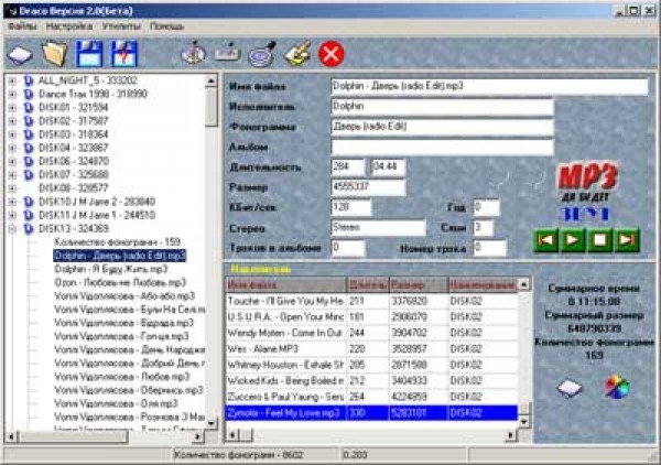 Программа позволяет Вам создать базу данных по Вашим mp3 дискам. Она умеет следующее: 1.Не использовать BDE. 2.Сканировать диски на предмет выявления файлов mp3 и автоматическое добавление информации из файлов в базу(kbit, Имя исполнителя и т.д.)3.Осуществлять поиск по имени файла, исполнителю, фонограмме, альбому по включениям или точному совпадению. 4.Автоматическая загрузка базы при запуске программы на основе настроек. 5.Автоматически заполнять Исполнителя и Фонограмму по имени файла в случае отсутствия соответствующей информации в тэге. 6.Проигрывать фонограмму если вставлен соответствующий диск. 7.Собирать в накопитель коллекцию фонограмм с указанием суммарного времени и размера. 8.Генерировать образ диска, собирая файлы с соответствующих дисков по информации из корзины, с возможностью переименования файлов, формирования тэгов, формирования плэйлиста для WinAmp, а также добавления самого WinAmpа. 9.Сканировать жёсткие и сетевые диски( на случай когда скопилось много на диске в времени записать на CD нет))) 10.Сканировать CD и папки на жёстких и сетевых дисках, сравнивать их с базой и те фонограммы которых нет копировать в указанную директорию. 11.Исправлять имена файлов на жёстком диске по шаблону на основе информации из тэгов, имени директорий или текстового файла. 12.Проигрывать фонограммы используя WinAmp. 13.Импорт экспорт накопителя.
