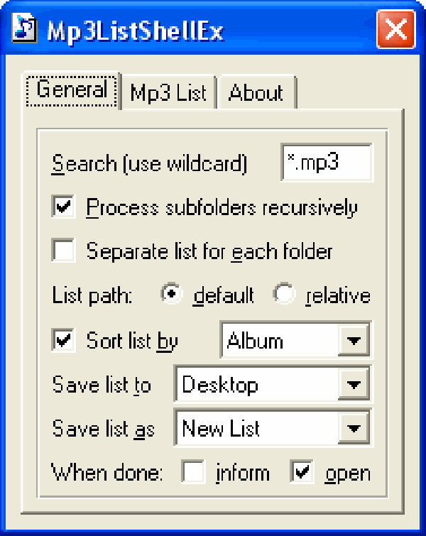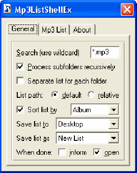 Небольшая программа, которая добавляет в контекстное меню проводника команду 'Create mp3 list' и позволяет легко построить много типов плейлистов и списков mp3-файлов на основе информации ID3 тэгов и MPEG фреймов. На сегоднешний день Mp3ListShellEx создает Media Player (.asx) и Winamp (.bpl, .m3u, .pls) плейлисты. Среди поддерживаемых списков - таблицы Excel (.xls, .csv) и Web документы (.htm, .xml). Программные настройки, такие как выходной маршрут и имя списка, дополнительные данные об mp3-файле, их порядок и другие могут быть заданы через раздел Mp3ListShellEx в меню 'Пуск'.