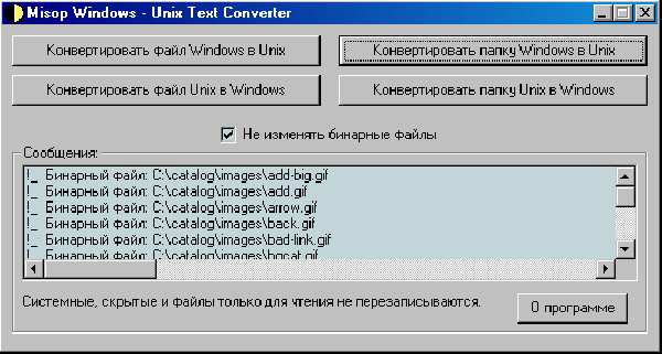 Помимо преобразования отдельных файлов программа может преобразовывать все файлы в указанной папке включая все вложенные папки. При этом имеется возможность игнорировать бинарные файлы и преобразовывать только файлы, которые содержат исключительно текстовые символы. В данном случае под бинарными файлами подразумеваются все файлы, в которых встречается хотя бы один символ из следующего набора символов:
