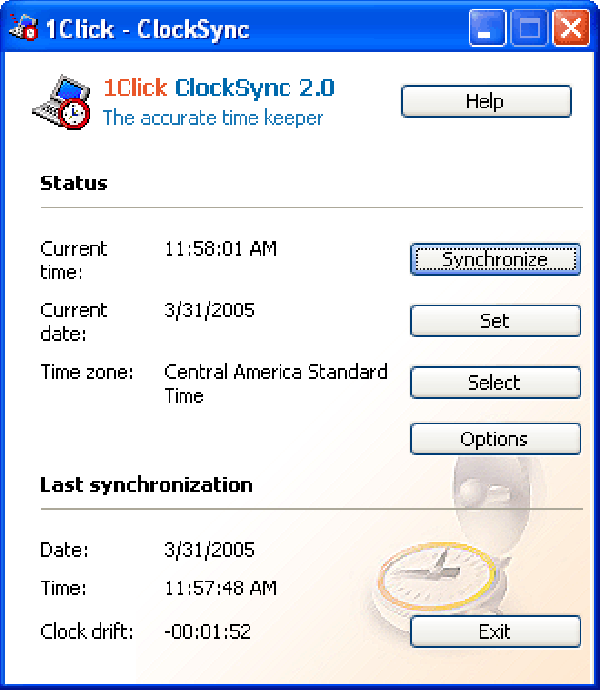 Программа поддерживает точность часов вашего компьютера. Это достигается путем синхронизации с высокоточными серверами "атомного" времени через Интернет. 1Click Clocksync поддерживает автоматический режим синхронизации и может работать как в локальной сети, так и через Интернет. В отличие от других подобных программ, 1Click Clocksync имеет очень простой и понятный интерфейс. Поддерживаются SNTP и TIME протоколы синхронизации.