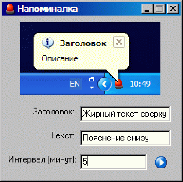 анная программка позволяет высвечивать сообщения из трея через указанный промежуток времени. Только для Windows XP
