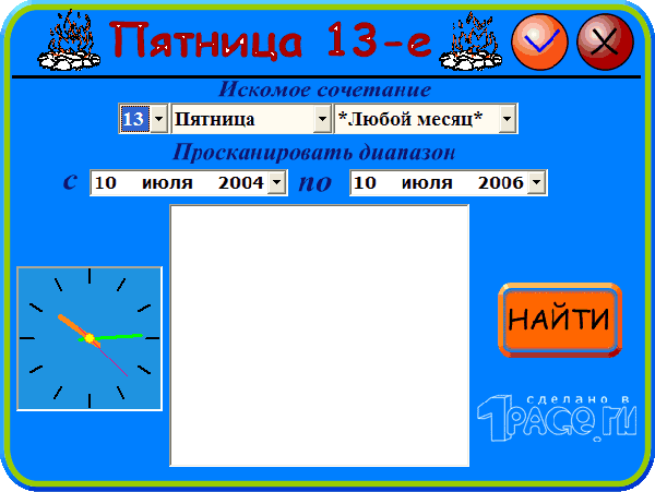 Программа названа в честь дня своего рождения :-) 13 февраля 2004 года (пятница) вечером по радио передали, что сегодня пятница 13-е, почему-то никто из знакомых в этот день не обратил внимание на это редкое явление и мне стало интересно, когда будет следующая подобная дата. Естественно листать календарь в поисках неудобно, поэтому и была написана эта программа.