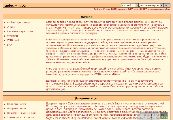 WTG представляет Zebra — программный комплекс для организации, наполнения, редактирования, администрирования и автоматизации сайта любой сложности со встроенными возможностями индивидуализации. Это собой расширяемая, гибко настраиваемая и конфигурируемая система, предоставляющая возможность подключения дополнительных модулей, обеспечивающих всевозможные нужды пользователя. В результате на базе Zebra можно сделать как сложный корпоративный сайт или коммерческий портал, так и личную страницу в Интернет. Разработка WTG Zebra ведется с ноября 2000 года. Zebra — основной программный продукт WTG, на базе которого мы предлагаем свои главные решения.