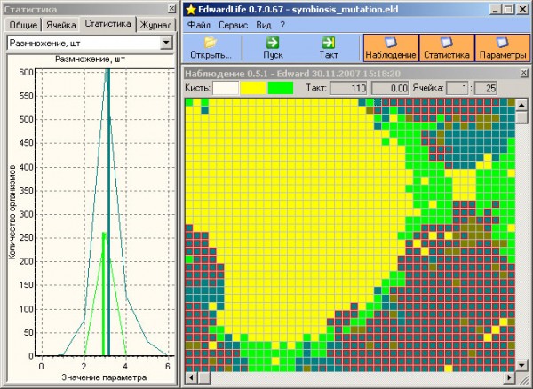 Главная особенность - возможность мутации (видоизменения) первоначальных организмов и приспособление их к окружающей среде. При первом запуске программы автоматически откроется пример demo1.txt, который и продемонстрирует некоторые возможности программы.
