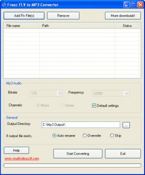 Специально для вас, компания SmallVideoSoft разработала бесплатную программу Freez Flv to Mp3 Converter. При конвертировании можно настраивать битрейт, канал и частоту.