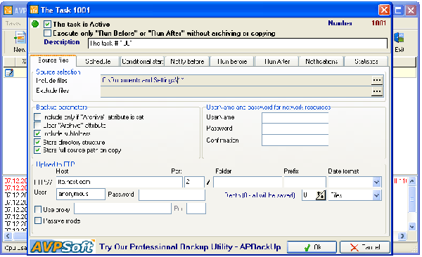 AVPSOFT Save2FTP простая в использовании бесплатная утилита для организации автоматического резервного копирования ваших критически важных данных на FTP сервера. Продвинутое расписание со всевозможными реакциями на ошибки при копировании данных на сервер, автоматическая дозвонка и разъединение, система оповещения администратора о ходе выполнения заданий, простой и понятный интерфейс, высокий уровень автоматизации - эти и многие другие возможности делают программу особенно необходимой для системных администраторов организаций а так же простых пользователей.