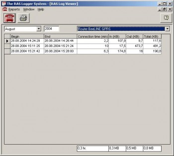 The RAS Logger System - это система протоколирования работы RAS (Remote Access Service - удаленный доступ к сети) и принтера. С помощью RAS Logger Вы сможете детально просматривать сколько данных было получено и передано через Dial-Up или VPN, какое время длилось это соединение, и, конечно же, какого числа, тем самым контролируя отчеты Вашего провайдера.