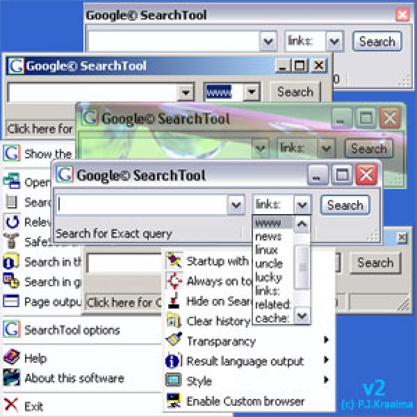 Утилита для поиска информации через известную поисковую систему Google. Ищет, как и сам поисковик, веб-страницы, картинки, сообщения в ньюсгруппах и ссылки в каталоге. Поддерживает 66 языков вывода, 27 языков поиска.