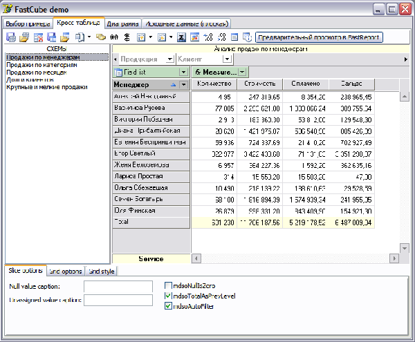 FastCube позволит вам без лишних затрат сил и времени проанализировать данные, получить сводные таблицы (срезы данных), построить отчеты и графики. Это удобное средство оперативной аналитической обработки больших массивов данных.
