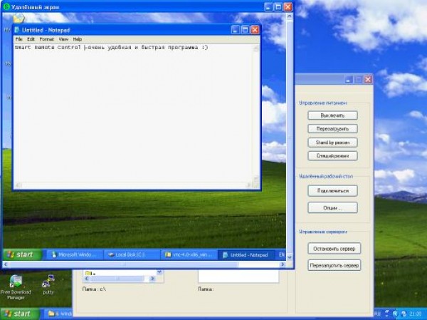 Smart Remote Control - программа, которая позволяет Вам осуществлять удаленное администрирование Вашего компьютера. Вы можете наблюдать рабочий стол Вашего удалённого компьютера, управлять курсором мыши, вводить данные с клавиатуры так же легко, как Вы бы это делали, сидя непосредственно за этим компьютером. Также с помощью программы Smart Remote Control Вы с лёгкостью можете осуществлять обмен файлами, управлять удалённым компьютером с помощью командной строки, удалённо выключать, перезагружать, вводить в спящий режим и режим пониженного энергопотребления.