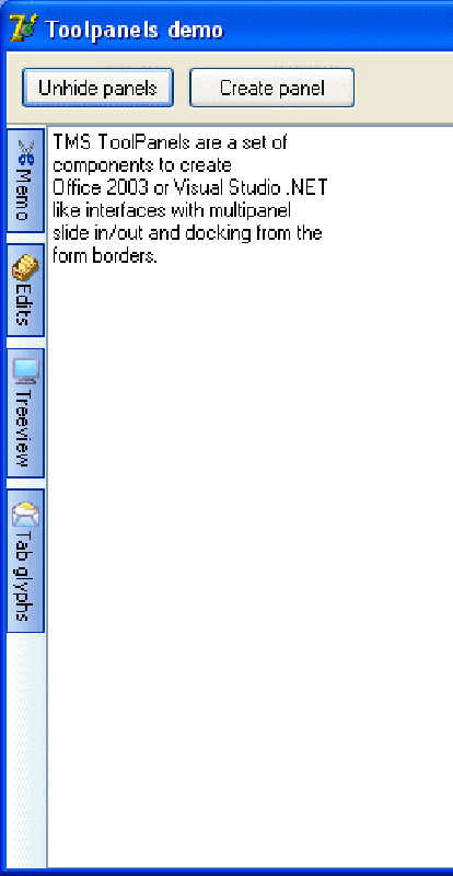 Компонент TMS ToolPanels - это визуальная студия .NET как скользящие/состыковавшиеся панели. Компонент TMS ToolPanels состоит из контейнерного TAdvToolPanelTab и TAdvToolPanel. TAdvToolPanelTab управляет скольжением TAdvToolPanel. Компонент TMS ToolPanels поддерживает управление просмотра вкладки Extensive, включая интеллектуальные протянутые фоны вкладки. TAdvToolPanel может иметь расширяемые разделы с большой визуальной настройкой появления.
