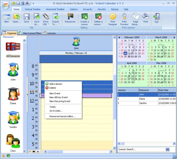 Универсальный календарь для учителей и учеников старших классов и колледжей. Позволяет отслеживать уроки и задания как одного ученика/учителя, так и всего класса. Два режима просмотра: с вертикальной и горизонтальной временной шкалой. Есть функция напоминания о важных событиях. Синхронизуется с Microsoft Outlook. Возможность экспорта в Xls, Txt, Xml.