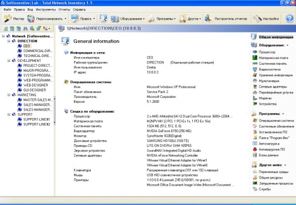Total Network Inventory — программа для автоматической инвентаризации компьютеров в сети. Не требует установки клиента. База данных аппаратного и программного обеспечения компьютеров всей сети всего за несколько минут в 2 клика! С помощью Total Network Inventory вы можете узнать подробную информацию о: процессорах, памяти, установленных HDD, количестве логических дисков, свободных слотах, видеокартах, мониторах, установленном ПО, запущенным процессам и сервисам.