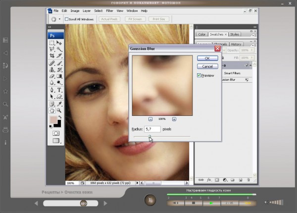 Каждый урок сопровождается в ней флэш-роликом, что позволяет любителям видео при просмотре иногда поглядывать в текст, а книголюбам сверяться при чтении с видео-иллюстрацией (см. скриншот). Схватываете всё на лету и хотите выучить Фотошоп за три часа? Разверните ролики во весь экран и смотрите в режиме нон-стоп как один полнометражный фильм (скриншот).