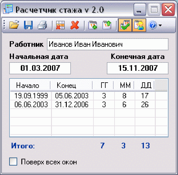 Программа "Расчетчик стажа" адресована работникам отделов кадров, бухгалтерам и вообще всем, кто работает с датами и временными периодами. Она позволяет вычислять количество лет, месяцев и дней между датами, расчитывать общий трудовой стаж сотрудника по записям в трудовой книжке, определять конечную дату периода, складывать и вычитать стаж, распечатывать введенные данные, сохранять эти данные в файл и загружать их из файла.