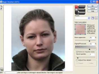 Magic Denoiser предоставляет возможность пользователю в случае необходимости подстраивать результат автоматического удаления шума путем изменения размеров образца шума и его местоположения на изображении или путем загрузки соответствующего пресета. Результат удаления шума может быть улучшен путем настройки контрола, регулирующего силу подавления шума и включения опции «Удаление импульсного шума» с выбором характерного размера спекла. Имеется также дополнительная возможность улучшения результата путем регулирования резкости тонких деталей изображения.