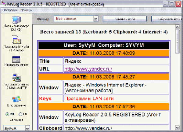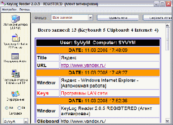 Ведет перехват набранного на клавиатуре текста и текстовых данных из буфера обмена. Ведет подробную статистику посещаемых Интернет сайтов, форумов, чатов.