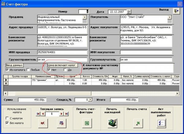 Программа «Счет-фактура» (форма 2006 г.) предназначена для оформления счет-фактур, счетов, накладных по форме «Торг-12» и актов выполненных работ. Программа проста в использовании и не требует от пользователя знаний бухгалтерского учета. Программа рассчитана на централизованное оформление бухгалтерских документов неограниченным количеством «своих» фирм. Она имеет неоспоримые преимущества для тех организаций, которые имеют несколько дочерних предприятий.Программа предоставляет пользователю следующие возможности: • Быстро оформлять и распечатывать счет-фактуры, счета, накладные по форме «Торг-12» и акты выполненных работ; • Иметь справочник данных по «своим» (дочерним предприятиям) и фирмам-клиентам; • Вести электронный журнал учета оформленных бухгалтерских документов, фирм-клиентов и дочерних организаций;• Распечатать в Excel журнал оформленных документов;• Система блокировки дублирующих номеров в журнале учета и сообщения о неоформленных документах позволяет избегать путаницы в учете документов;• Изменять параметры оформления документов; • Самому редактировать документы в Excel;• Составлять каталог выпускаемой продукции или оказываемых фирмой услуг и составлять документы на основе этого каталога;• Формировать каталог выпускаемой продукции или оказываемых фирмой услуг в Excel и импортировать его в базу данных;• Распечатывать прайс-лист в Excel на основе каталога товара (услуг);• Производить быстрый поиск оформленных документов по клиентам и «своим» фирмам;• Производить резервное копирование базы данных на любой магнитный носитель информации.Устанавливается в комплекте с Office XP (2002), 2003, 2007 или Access Runtime, распространяемый компанией Microsoft бесплатно.
