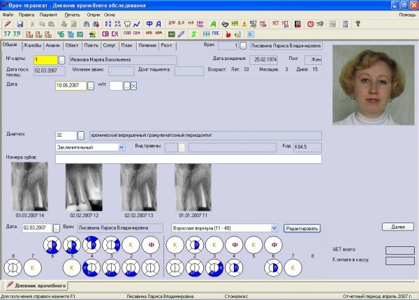 При наличии любого визиографа, поддерживающего экспорт снимков в формате .jpg, есть возможность привязать снимки к пациенту. При написании номера карты в дневнике врачебного обследования сразу отражаются все рентгеновские снимки этого пациента.