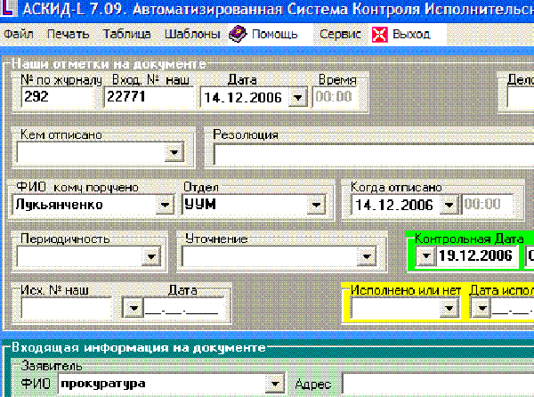 Учет входящих документов и контроль исполнения решений. При включении показывает и печатает долги. Печатаются листы в книгу регистрации документов, карточка учета жалоб и заявлений, контрольная карточка на входящие документы, ответы заявителю, списки неисполненных и просроченных дел. На бланках конвертов печатаются реквизиты отправителя и получателя. Доступ к электронным копиям документов. Автоматическое резервное копирование. Условно совместима по данным с предыдущими версиями. Решает одну из задач документооборота предприятий.