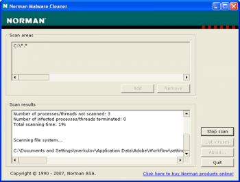 Norman Malware Cleaner - программа поиска и удаления вредоносных приложений на вашем компьютере, имеющая большую базу данных вирусных записей, включающая различные варианты опасных ПО семейства Mydoom, Mytob, Netsky, Rootkit, Blaster, Sasser и многих других. Программа позволяет останавливать вредоносные процессы в оперативной памяти, удалять файлы вирусов с жесткого диска, включая компоненты ActiveX и вспомогательные модули браузеров, исправлять измененные ключи реестра и удалять ссылки на запуска вирусов связанных с обычными файлов. Помимо этого, в программе есть поиск и удаление руткитов - имеющихся в системе скрытых модулей. Также есть режим работы через командную строку.