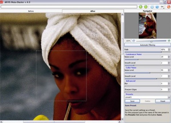 AKVIS Noise Buster снижает шумы матрицы цифровой камеры и шумы, появившиеся при сканировании фотоснимка, устраняет неоднородные цветовые пятна на картинке, сохраняя детали и чёткость границ.