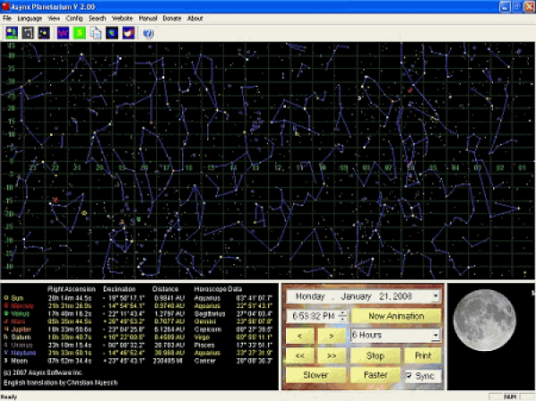 Программа для просмотра карты звездного неба. С помощью Asynx Planetarium возможно просматривать звездное небо, содержащее более 2500 звезд, 88 созвездий, 9 планет, включая Плутон, а также увидеть любую фазу Луны, начиная с 1600 по 9999 год. Доступно переключаться между тремя разными видами неба: геоцентрическим, гелиоцентрическим и горизонтальным. Показательной функцией является возможность "прокручивать" время вперед и назад, с наглядным отображением движения планет относительно звезд, солнца и друг друга. По каждому объекту приводится подробная информация о его местоположении (долгота, широта и т.д.). Программу можно порекомендовать начинающим астрономам и всем, кто увлекается астрономией на любительском уровне.