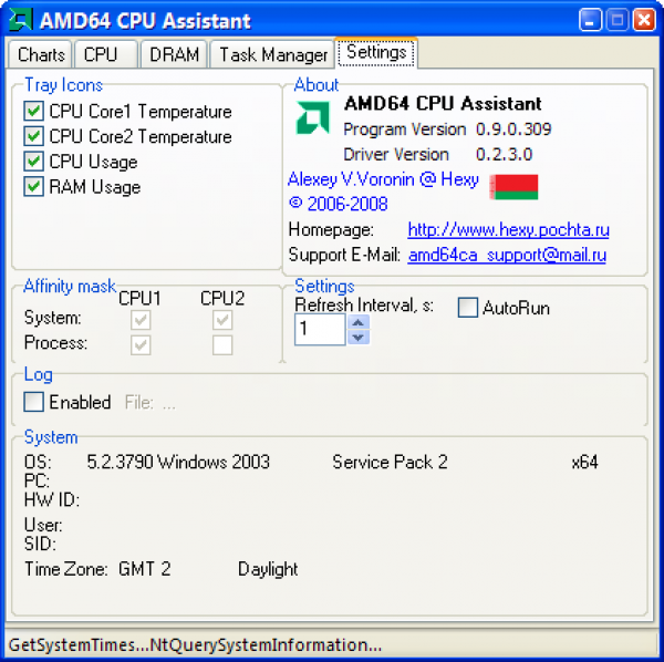 AMD64 CPU Assistant - программа предназначенная для мониторинга температуры ядер процессоров семейства AMD64 с показанием встроенного в ядро термального сенсора с отображением в трее температуры ядра, загрузки памяти и процессора.