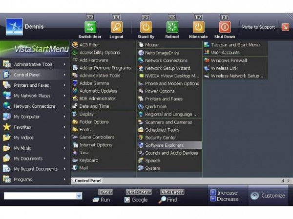Vista Start Menu - программа замены стандартного меню Пуск ОС Windows. Выполенна в стиле ОС Windows Vista и содержит разнообразные дополнительные функции,элементы и возможности, которые делают новое меню более удобным. При открытии пользователь сразу же получает доступ к командной строке и ко всем кнопкам управления питанием вашего ПК, а также программа может запустить поиск информации в Интернете или в локальной сети. Программа построена на управление с помощью клавиатуры, что позволяет осуществлять быстрый доступ ко всем элементам меню, при этом используя всего лишь две-три клавиши. Данное меню легко подстраивается под любое разрешение экрана благодаря возможности изменения его размеров и кнопкам уменьшения/увеличения масштаба шрифта.