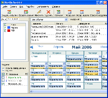 Mozilla Sunbird - многоплатформенная программа-календарь, сделанная на основе кода Mozilla, оснащена полезными функциями, в их числе планирование событий, просмотр текущих дел, напоминание по времени, дате и другие. Mozilla Sunbird может редактировать и просматривать внесённые данные за определённый день (время расписано по часам), неделю и месяц. Также присутствует возможность коллективной работы с данной утилитой через HTTP протокол. Для этого сервер должен поддерживать WebDAV (World Wide Web Distributed Authoring and Versioning), на котором будет установлена программа. Одной из отличительных черт Mozilla Sunbird является возможность встраиваться в браузеры Mozilla и Firefox, а также в почтовый клиент Thunderbird. Программа работает на платформах Windows, Mac OS X, Linux и распространяется бесплатно.
