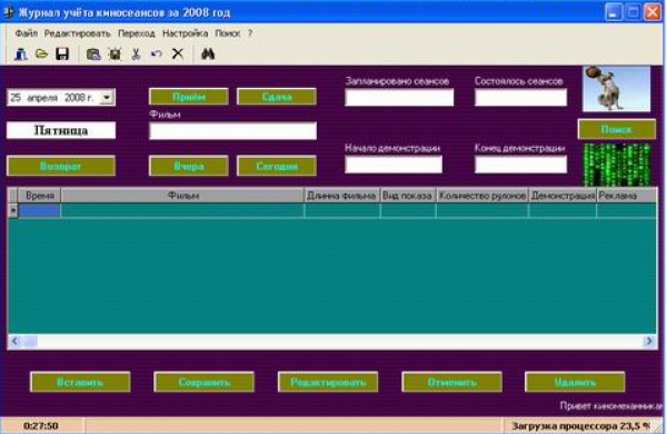 Программа “Журнал” является аналогом бумажного журнала для ведения учёта киносеансов в киноаппаратной кинотеатра. Программа позволяет вести записи: времени демонстрации, название фильма, продолжительность фильма, вид проекции, количество рулонов, состояние демонстрации, наличие рекламных роликов. Имеется так же поддержка горячих клавиш, голосовое и визуальное напоминание, учёт приёма и сдачи фильмокопий.