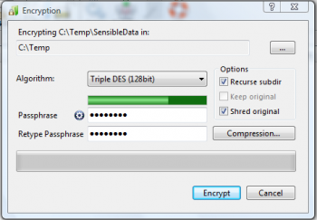 Программа для шифрования важной информации на винчестере. Шифрование происходит по алгоритмам (DES (64 битный ключ), Triple DES (128 bit), AES-Rijndael (до 256 бит, AES - это американский стандарт криптозащиты), Blowfish (до 448 бит), ArcFour (до 2048 бит).