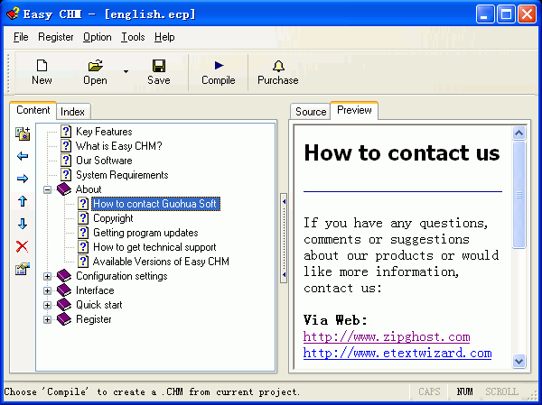 Программа для создания электронных книг, справочных руководств, электронных журналов в формате CHM. Для создания необходимо указать папку, содержащую HTML-файлы. Easy CHM самостоятельно составляет меню документа на основе заголовков файлов.