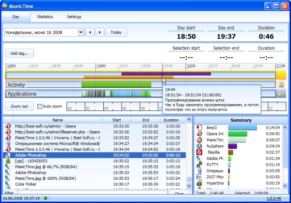 Посередине главного окна программы располагаются три временные диаграммы: Tags, Activity, Applications. В Tags вы можете добавлять себе задания, например, с 18:45 до 19:45 заниматься программированием. После добавления этого задания, часть временной диаграммы будет закрашена цветом задания. Под диаграммой Tags располагается диаграмма Activity, она отображает вашу пользовательскую активность. Если вы активно используете компьютер, то полоска зеленая, не активно - красная. Третья полоса - Applications. Каждой запущенной программе назначается уникальный цвет. В момент, когда вы работаете с какой-либо программой, полоса окрашивается в определенный цвет. Внизу окна расположен список всех активных программ, дата начала и конца использования, а также продолжительность. Поработав несколько дней с ManicTime, вы получите подробный отчет того, сколько вы потратили времени на определенный проект (тот, что заполняется в поле tag). Программа ManicTime абсолютно бесплатна. Для установки требуется пакет .Net Framework 3.5. Все данные хранятся на локальном компьютере. В сеть программа не лезет. Также хочется отметить отличный дизайн интерфейса. С программой действительно удобно работать.