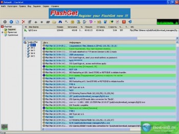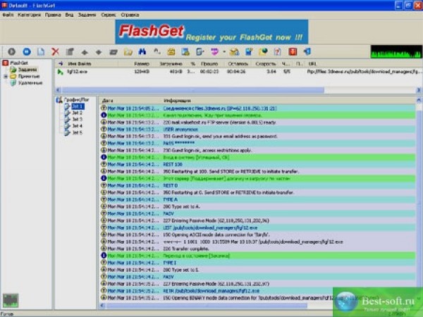 FlashGet - очень удобный downloader. Умеет работать по расписанию, качать файлы по частям (причем показывает графическую карту скачивания и заголовки), добавлять комментариям, раскладывать файлы по категориям, и т.д. FlashGet перехватывает клики в браузере, мониторит буфер, поддерживает drag-n-drop, может экспортировать лог своей работы в HTML. Умеет искать зеркала и вычислять наиболее быстрые из них. Поддерживает скачивание с HTTPS сайтов и скины. FlashGet раньше назывался JetCar.