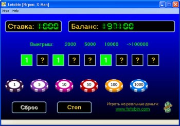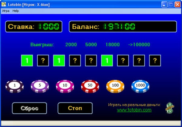 Перед вами 9 (в Lotobin 9) или 11 (в Lotobin 11) закрытых ячеек. В 4 из них (для Lotobin 11 - в 5) скрыты "1", в остальных - "0". Ваша задача - угадать, в каких ячейках содержатся "1" и открыть только эти ячейки. Если вы правильно откроете 1 ячейку, Ваша ставка увеличивается в 2 раза, 2 ячейки - в 5 раз, 3 ячейки - в 18 раз, 4 ячейки - в 100 раз (для Lotobin 11: 1 ячейка - в 2 раза, 2 - в 5 раз, 3 - в 15 раз, 4 - в 60 раз, 5 - в 420 раз). Если на любом этапе игры вы откроете "0", весь ваш возможный выигрыш анулируется. Забрать выигрыш вы можете, нажав на кнопку "Стоп". Максимальная ставка - 1000 у.е. Минимальная - 0 у.е. (пробная игра).
