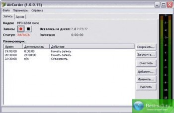 AirCorder - программа, предназначенная для записи (архивирования) эфира радиостанции на жестком диске компьютера. Архивирование может понадобиться, например, в качестве аргумента в споре с рекламодателем как доказательство факта выхода рекламы, или пригодиться при различного рода проверках. Запись может вестись 24 часа в сутки, или в определенные промежутки времени. Программа использует современные алгоритмы сжатия звука, поэтому создаваемые файлы имеют очень малый размер. Особенности: - автоматический старт/стоп записи в заданное время (планировщик) - кодирование в mp3, ogg или другим кодеком "на лету" (без промежуточной записи в WAV) - низкая загрузка процессора - ведение истории записей - автоматическое удаление старых записей - множество настроек - многоязычный интерфейс