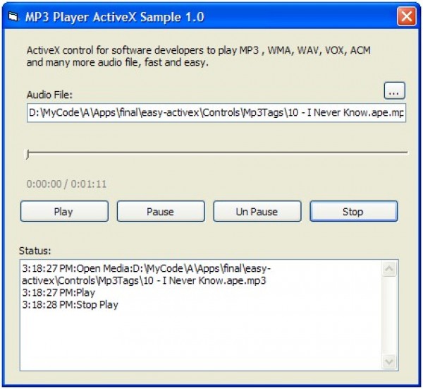 MP3 Player ActiveX это OCX контрол для разработчиков программного обеспечения, позволяет проигрывать аудиофайлы в формате MP3, WMA, WAV, VOX, ACM непосредственно из приложения. Контрол поддерживает множество различных событий, например, проигрывание файла в более быстром темпе. В дистрибутив также входит CHM-справка и пример программы на языке VB6 и VB.NET.