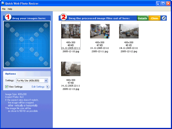 Иногда бывает, что вам нужно изменить размер графического изображения, чтобы отправить его другу или опубликовать на сайте. Quick Photo Resizer как раз умеет это делать. И делает она это весьма необычным способом. Вы просто выбираете схему ресайза и перетаскиваете изображения в окно программы. Программа Quick Photo Resizer сама автоматически выберет необходимое качество JPEG сжатия для каждого файла.