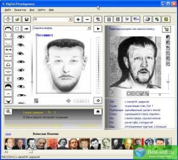 Вы встретились с незнакомым человеком. Какой у него характер, какой вид деятельности для него наиболее предпочтителен? Возможно ли это узнать, посмотрев на его лицо? Есть профессии, в которых для квалифицированного выполнения обязанностей и достижения мастерства, специалист должен обладать не только специфическими профессиональными знаниями, но и опытом "чтения лица" человека. Это врачи, юристы, адвокаты и следователи, художники, писатели и психологи. Древняя оккультная наука "физиогномика" тысячелетиями пыталась доказать существование связей между лицом и судьбой человека. Физиогномика происходит от греческих слов "природа" и "знание" и означает искусство познавать по чертам лица характер человека, его судьбу. Выражение лица является результатом эмоций, действующих на человека и оставляющих на нем "печать" на всю оставшуюся жизнь. В этом смысле лицо человека является его визитной карточкой, на которой можно прочитать не только чувства, но характер и судьбу. Для того чтобы стать хорошим физиогномистом нужно было знать многое: не только сложившиеся веками сведения, но психологию и национальные особенности черт лица и характера. И в настоящее время в некоторых странах физиогномика широко распространена, изучается в высших учебных заведениях. Издается огромное количество специальной литературы. Знаменитые физиогномисты пользуются большим авторитетом. Даже не будучи знакомыми с физиогномикой, многие люди, особенно обладающие хорошо развитой интуицией, в состоянии оценить, хорошее или плохое впечатление производит на них незнакомый человек. На уровне подсознания все немного физиогномисты. Знакомые фразы: "какое глупое лицо", "безвольный подбородок", "хитрые глаза". Вывод: Непредубежденный человек получает первое впечатление о незнакомце на подсознательном уровне. Физиогномика в цифрах. По фотороботу (лоб, скулы, подбородок, глаза, брови, нос, рот, уши) программа определяет характер и строит психологический портрет человека (темперамент, интеллект, оптимизм, конформизм, эгоизм, самооценка, сила воли, сексуальность, везучесть, чувство юмора). Новая русская версия программы включает библиотеку из нескольких сот фотографий и подобранных фотороботов известных людей России и всего мира - миллиардеров, политиков, бандитов, артистов и писателей. В новой версии Вы сможете найти, кто из известных людей похож на Вас. В полной версии программы Вы сможете легко добавить свое лицо в галерею знаменитостей.