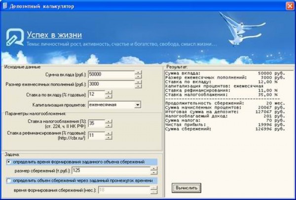 Программа «Депозитный калькулятор» позволяет оценить размер ваших будущих сбережений при использовании банковских вкладов, подобрать и сравнить условия вкладов. Программа осуществляет решение двух задач: