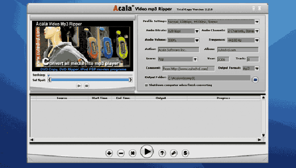 Acala Video mp3 Ripper - программа для извлечения музыки из видеофильмов и сохранения ее в формате mp3. Программа способна грабить аудио из видео форматоа divx, xvid, avi, mpg, mpeg, vob, vcd, svcd. Простой интерфейс. Есть функция автоматического выключения компьютера после окончания процесса конвертации.