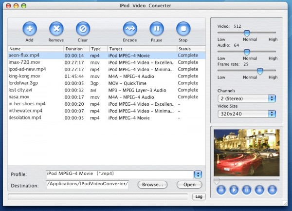 iPod Video Converter for Mac - программа для конвертации видеофайлов в файлы, которые может воспроизводить iPod. Работает под управлением операционной системы MacOs. Работает с форматами AVI, MPEG, WMV, MOV, MP4, VOB, DivX, XviD, AAC, AV3, MP3.