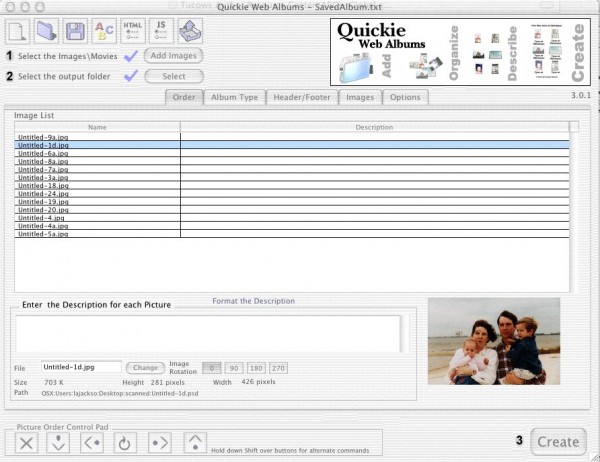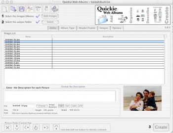Quickie Web Albums - программа для быстрого создания фотоальбомов. Позволяет определить расположение каждой картинки, добавить описание и множество других опций. Зарегистрированные пользователи могут использовать собственные шаблоны оформления, сохранять конфигурацию, сохранять список изображений.